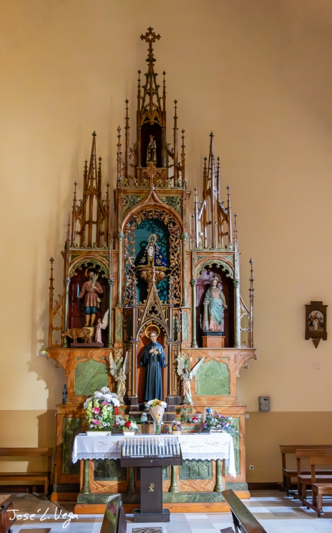 La capilla presenta como motivo central una ventana de tracería gótica enmarcada por dos pilastras y un arco. Dos escudos de la familia tutelar de la capilla flanquean la ventana, uno de ellos sobre una torre semicircular, que se corresponde en el interior con una escalera de caracol sin apoyo central. Esta escalera sirve de acceso a una terraza.