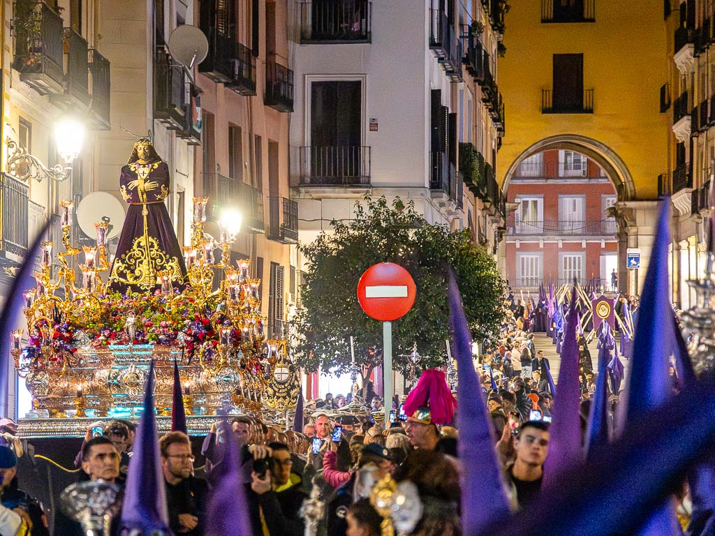El paso seguido de cerca por la imagen de María Santísima del Dulce Nombre en su Soledad han recorrido varias calles de Madrid en plena noche.