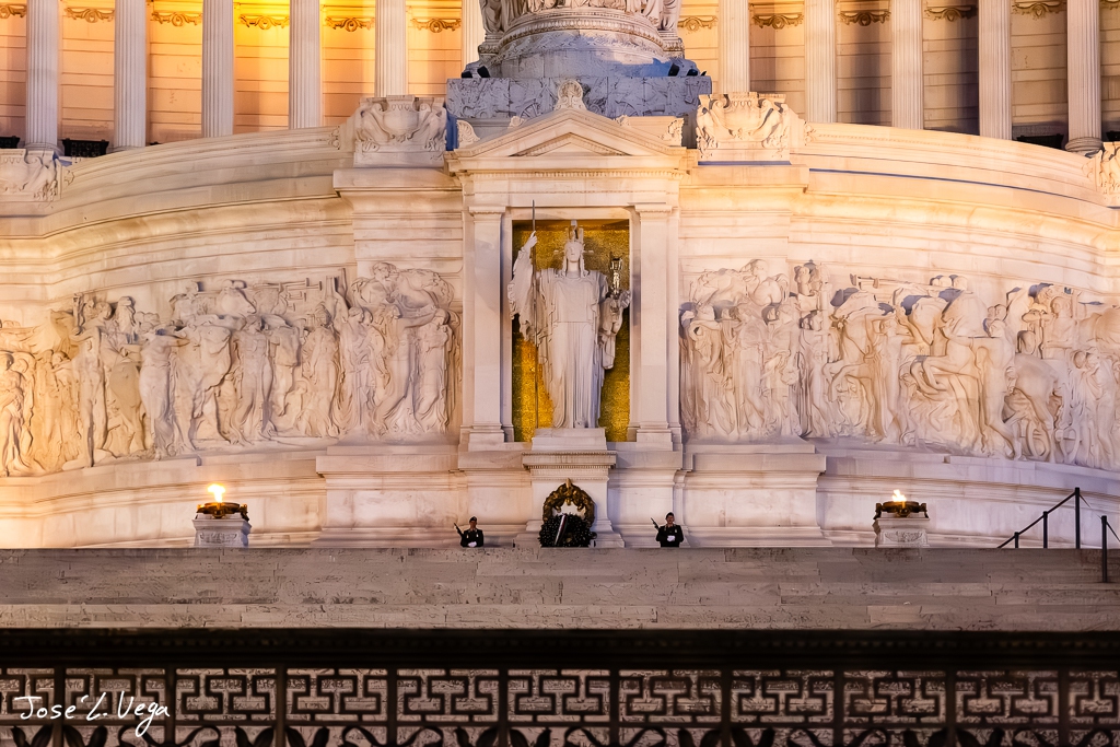 El monumento también cuenta con una serie de columnatas y esculturas alegóricas que representan regiones italianas y virtudes cívicas. En su parte superior, dos cuadrigas, conducidas por Victorias aladas, coronan el edificio, simbolizando la unidad y la libertad de Italia.
