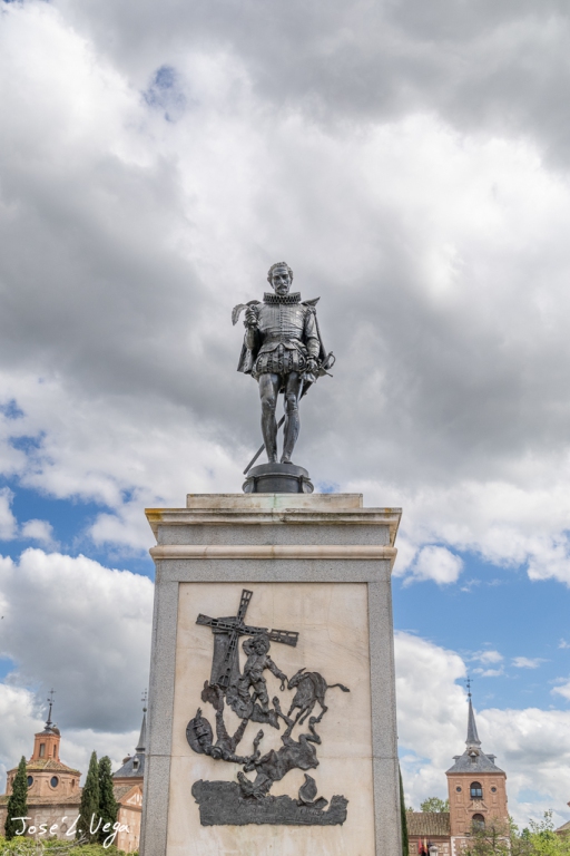 Escultura frente a la casa-museo natal de Cervantes en Alcalá de Henares, Madrid.